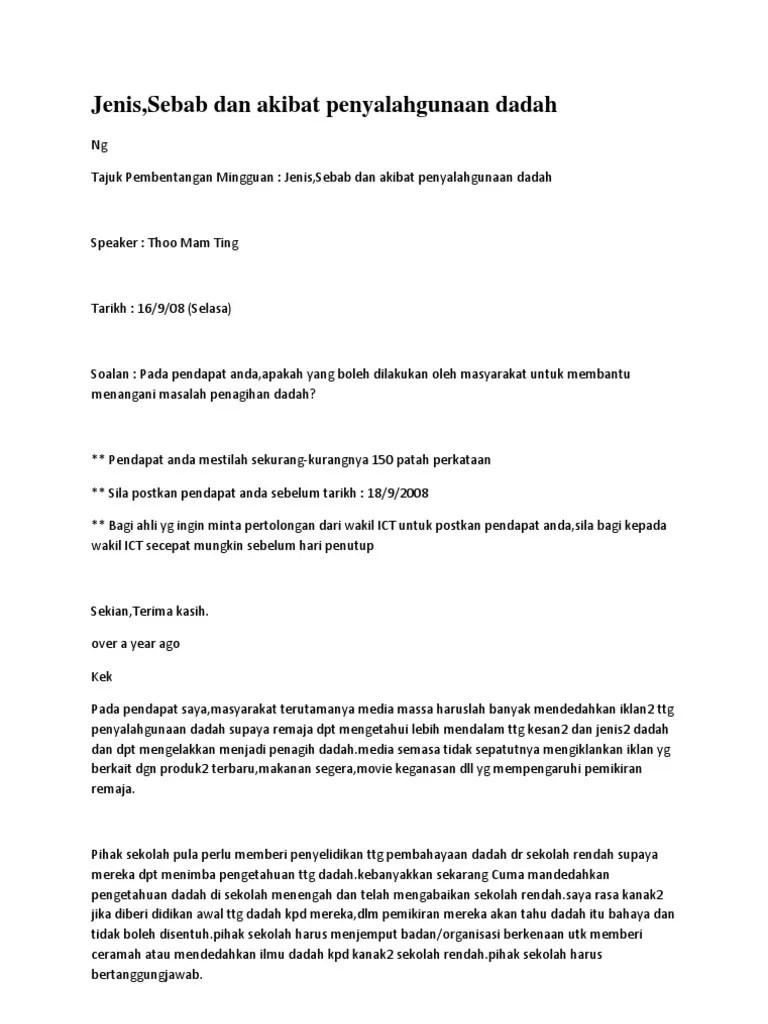 Kesan negatif penyalahgunaan dadah terhadap keluarga 1. Sesiapa yang menagih dadah akan mencemarkan . Akibat ke atas keluarga penagih: Satu sindrom fizikal dan psiko logikal yang negatif akibat pemberhentian penggunaan dadah dengan mendadak. Maruah dan nama baik keluarga penagih tercemar. Penyalahgunaan dan penagihan dadah boleh memberikan kesan besar kepada seseorang individu, keluarga, komuniti dan masyarakat. Xin xiang ang 203695 *menjatuhkan maruah dan nama baik sesebuah keluarga. Oleh itu, nama keluarga akan terjejas. Maruah dan nama baik keluarga penagih akan . Penyalahgunaan dadah disebabkan genetik, kesihatan mental, keluarga dan persekitaran sosial berupaya untuk merosakkan otak. Penyalahgunaan dadah akan menyebabkan beberapa kesan kepada penagih. Keluarga penagih akan menghabiskan masa, . Persengketaan dan perselisihan antara masyarakat berlaku akibat penglibatan anggota masyarakat dengan dadah. Perceraian dan perpisahan antara keluarga. Maruah ibu bapa dan keluarga tercemar.